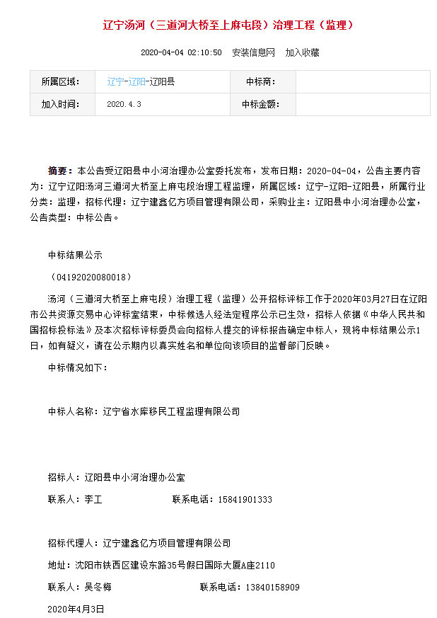 遼寧省水庫(kù)移民公司中標(biāo)遼寧湯河(三道河大橋至上麻屯段)治理工程(監(jiān)理)...