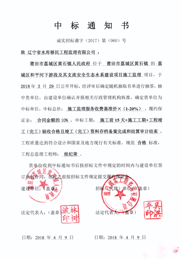 遼寧省水庫移民公司中標荔城區(qū)和平河下游段及其支流安全生態(tài)水系建設項目施工監(jiān)理...