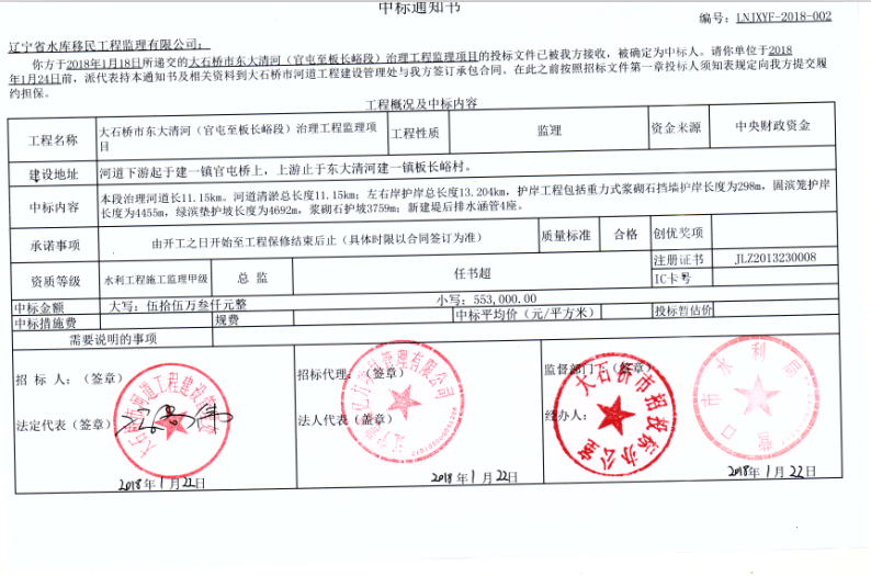 遼寧省水庫移民公司中標大石橋市東大清河(官屯至板長峪段)治理工程施工監(jiān)理...