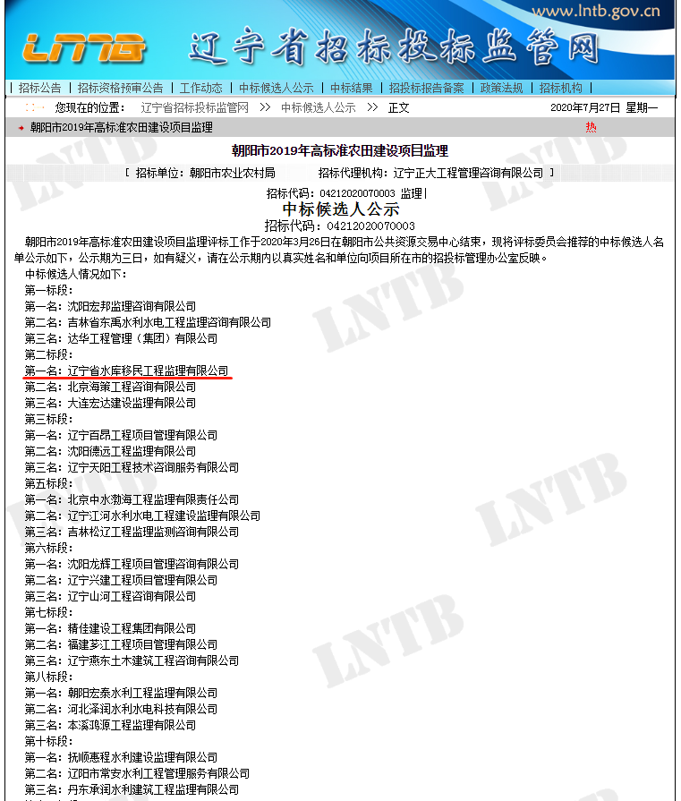 遼寧省水庫移民公司中標朝陽市2019年高標準農(nóng)田建設項目監(jiān)理第二標段